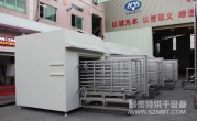 (8)烘干箱內(nèi)可存放1輛推車。推車配置耐高溫角輪(定向輪、萬向輪各2個(gè)),推車?yán)锩姘惭b限位柱用于定位里面托盤,兩側(cè)配有L形托架,用于支撐及左右限位托盤。進(jìn)出口裝有手動(dòng)爐門。頂部部置循環(huán)風(fēng)機(jī)、蒸氣換熱器等裝置,排廢風(fēng)機(jī)安裝在爐體頂部。